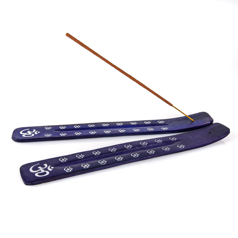 Stojánek na vonné tyčinky - lyže Manju Om fialová, zdobená potištěnými motivy.
