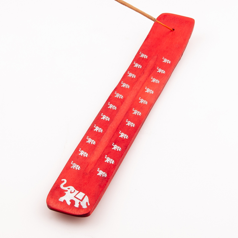 Stojánek na vonné tyčinky - lyže Manju Slon červená, zdobená potištěnými motivy.