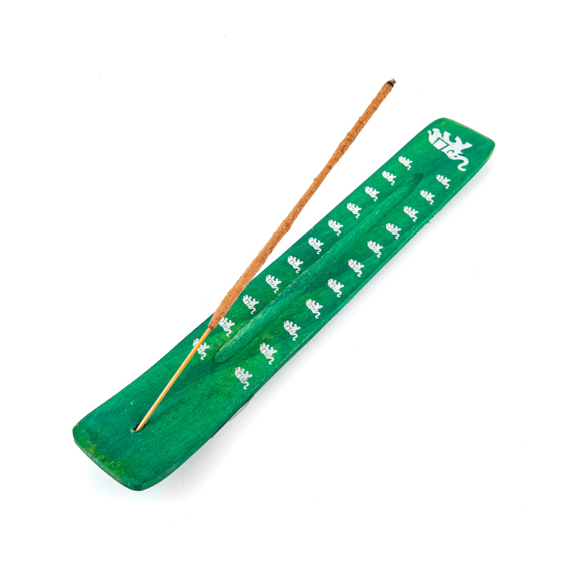 Stojánek na vonné tyčinky - lyže Manju Slon zelená, zdobená potištěnými motivy.