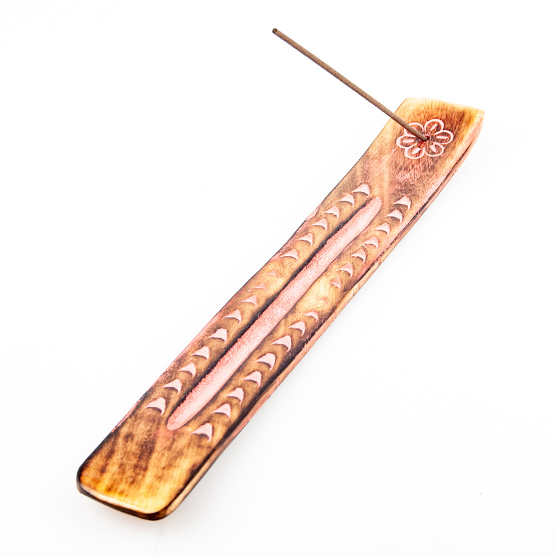 Stojánek na vonné tyčinky ve tvaru lyže, zabarvený do růžova, zdobený ručně vyřezávanými motivy.