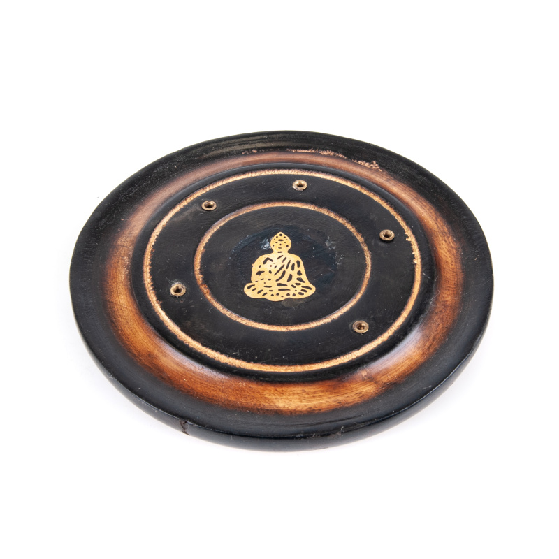 Kulatý stojánek se středem zdobeným Buddhou. Dřevěný stojánek je určen k pálení vonných tyčinek.