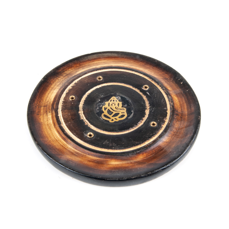 Kulatý stojánek se středem zdobeným hinduistickým bohem Ganeshou. Dřevěný stojánek je určen k pálení vonných tyčinek.