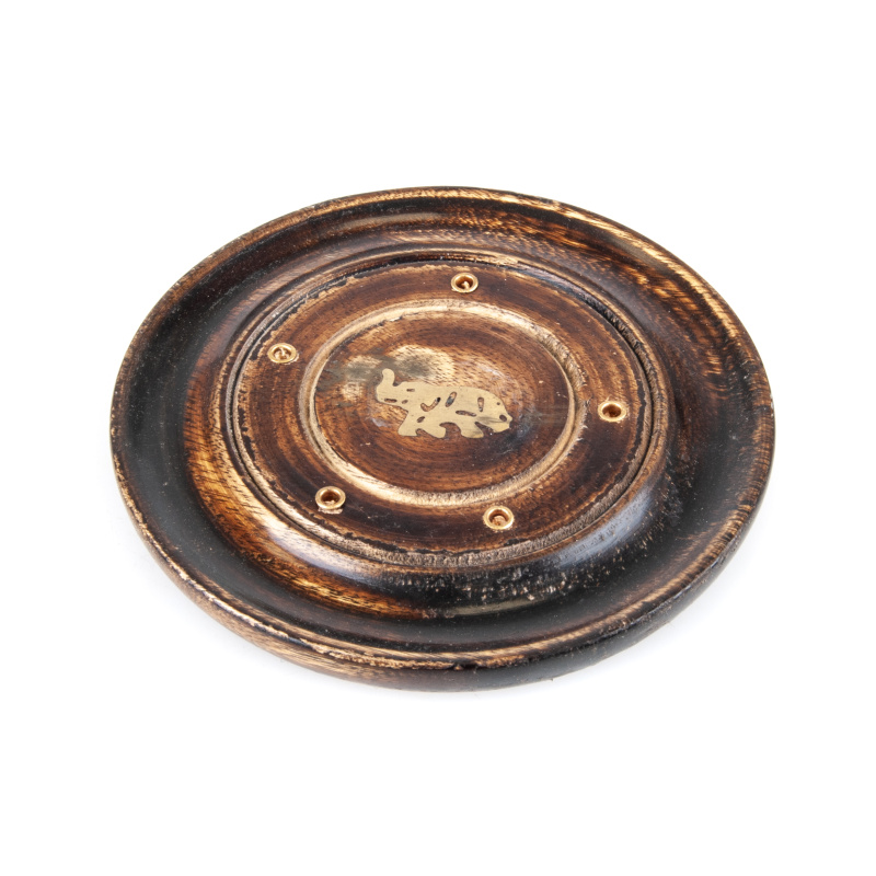 Kulatý stojánek se středem zdobeným slonem. Dřevěný stojánek je určen k pálení vonných tyčinek.