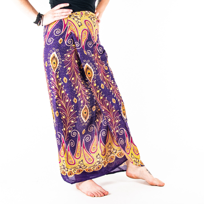 Bavlněná sukně Peacock Feathers ve fialové barvě s více možnostmi uvázání