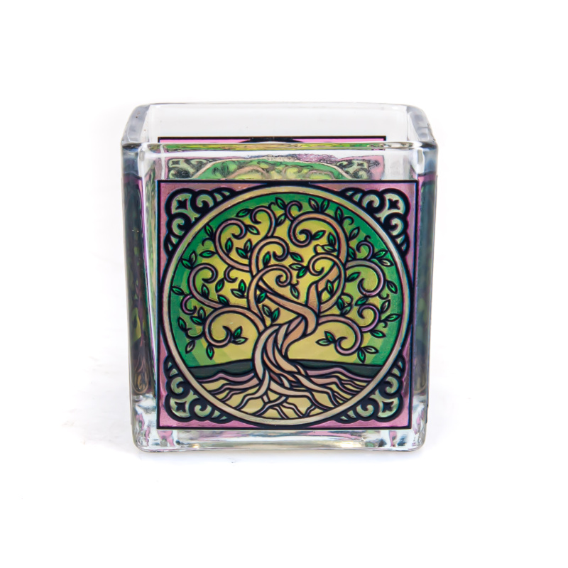 Skleněný svícen s motivem stromu života je elegantní a dekorativní doplněk určený pro čajovou svíčku.