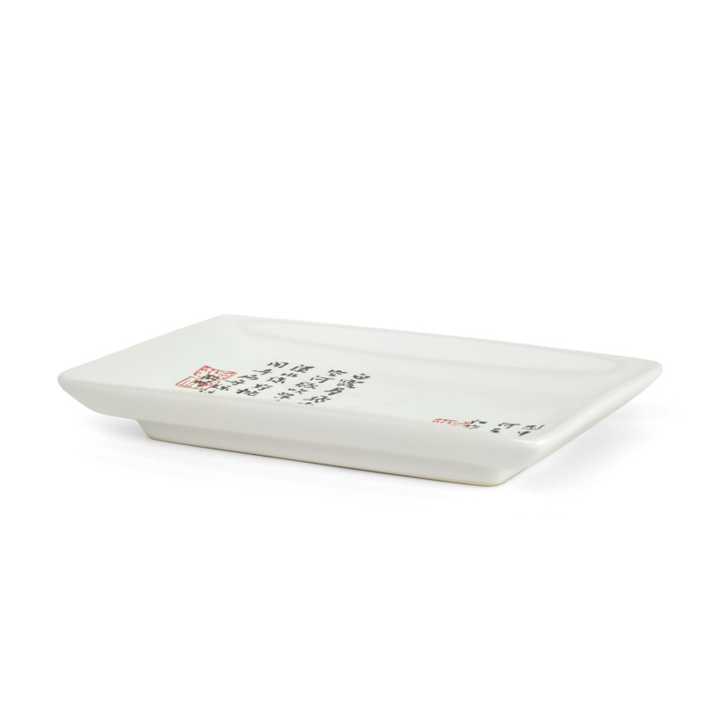 Menší bílý tác/talířek v čínském stylu, zdobený černými a červenými znaky. Skvěle se hodí pro servírování sushi, ale báječně na něm budou vypadat také jarní závitky či jiné drobnější pokrmy.
