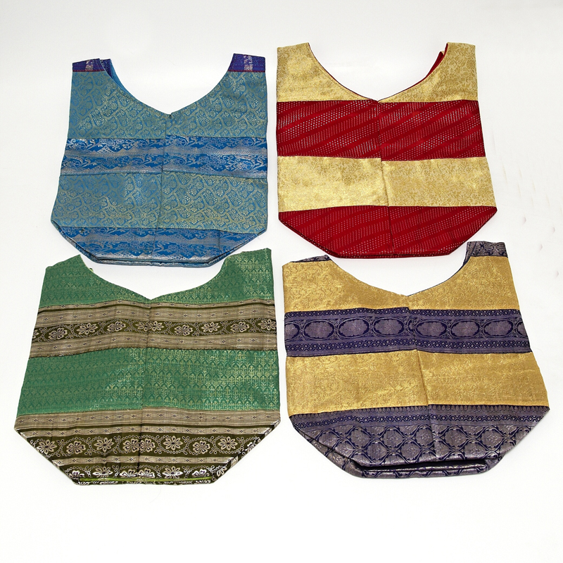 Originální tašky Nandini jsou šity ručně z odstřižků látky s imitací brokátu, a každý kus je naprostý unikát. Imitace brokátu působí přepychově a elegantně - jde o bohatě tkaný materiál s jemným leskem. Tašky jsou zdobeny tradičními orientálními vzory, mezi nimiž najdete i klasické kašmírové motivy. Nápaditý patchwork vytváří poutavé kompozice barev, struktur a vzorů, které zaujmou na první pohled a neobyčejně oživí i jednodušší outfit.
