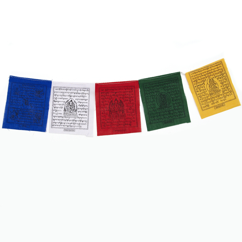 Tibetské modlitební praporky mají 5 různých barev, které zastupují 5 elementů země. Červená barva - oheň, zelená - dřevo, žlutá - země, modrá - voda, bílá - kov. Každý praporek nese buddhovo učení (mantry a sútry) a vyobrazení pěti různých manter.