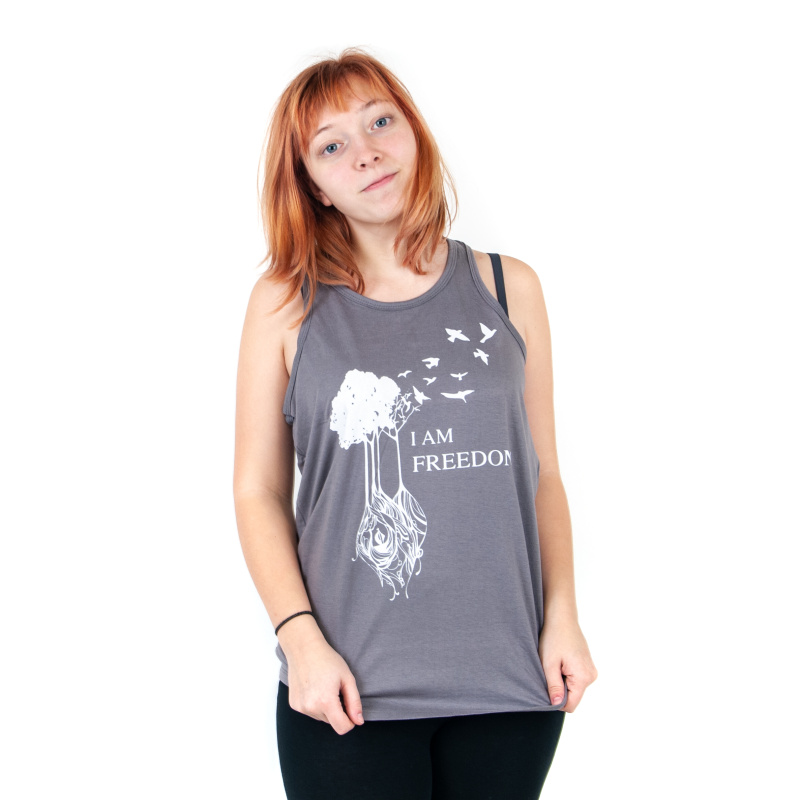 Dámské tílko s potiskem a pozitivní mantrou I AM FREEDOM v šedé barvě, velikost L