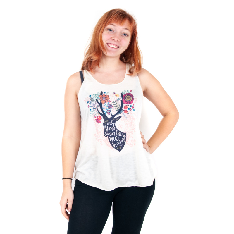S veselým motivem Happy Deer na tílku zaručeně prozáříte den nejen sobě. A je úplně fuk, jestli v tílku hodláte předvádět pozici kobry a pozdrav slunci nebo se promenádovat po pláži.
