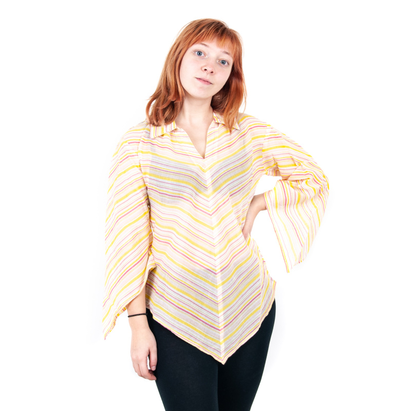 Elegantní halenka s rozšířenými tříčtvrtečními rukávy a límečkem se stane oblíbeným kouskem ve vašem šatníku. Jemná bavlněná tkanina, ze které je zhotovená, je ideální pro horké letní dny a zároveň poskytuje pocit pohodlí.