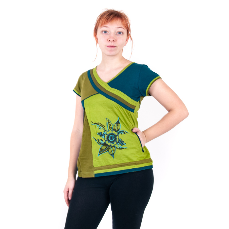 Modrozelený top s květinovým motivem a malou kapsičkou na zip Joy 12, velikost M