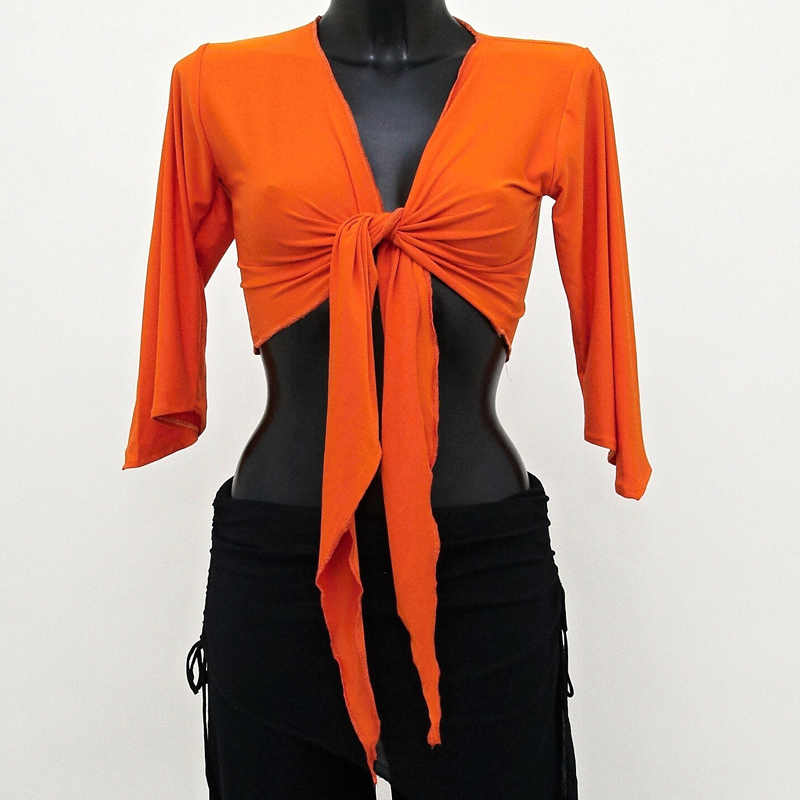 Top na orientální tanec Kamas ze splývavého elastického úpletu. Top má 3/4 rukávy a vázačku na předním díle.