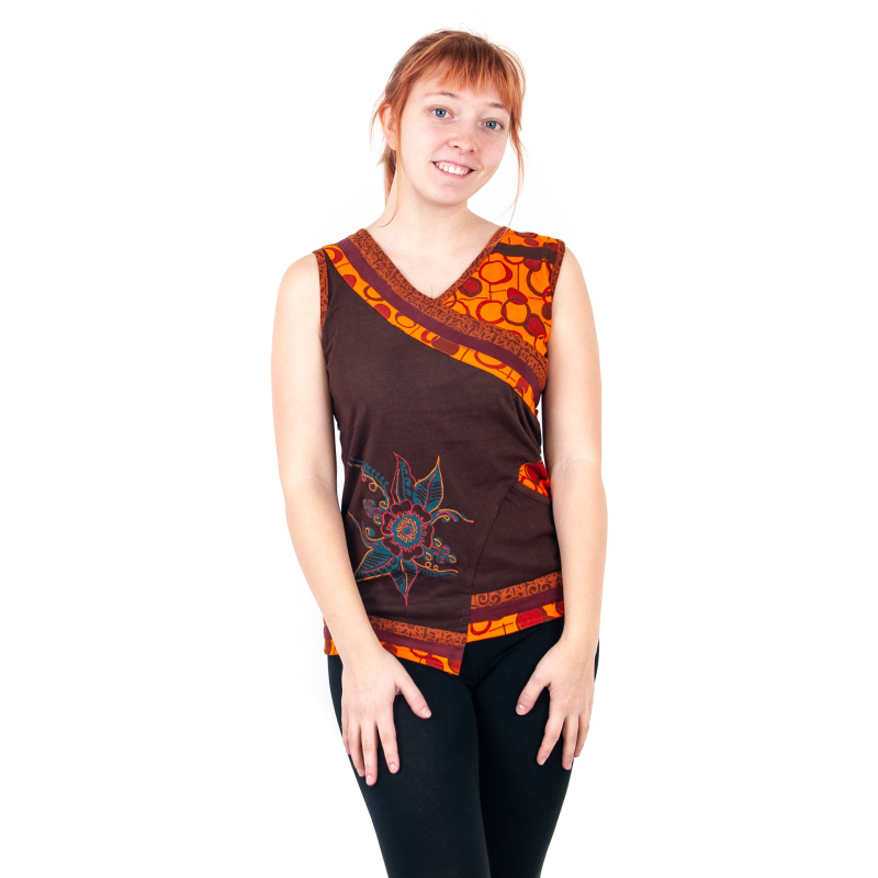 Parádní letní top bez rukávů, s vyšitou květinou a zajímavými vzory, velikost M, barva oranžová