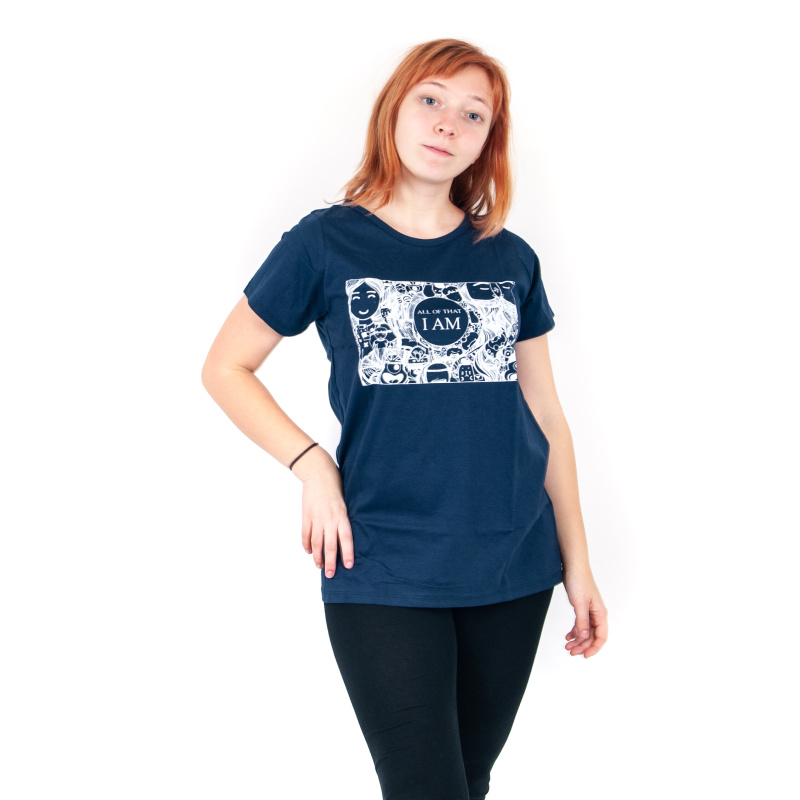Dámské tričko s potiskem a pozitivní mantrou I AM ALL OF THAT v modré barvě, velikost M