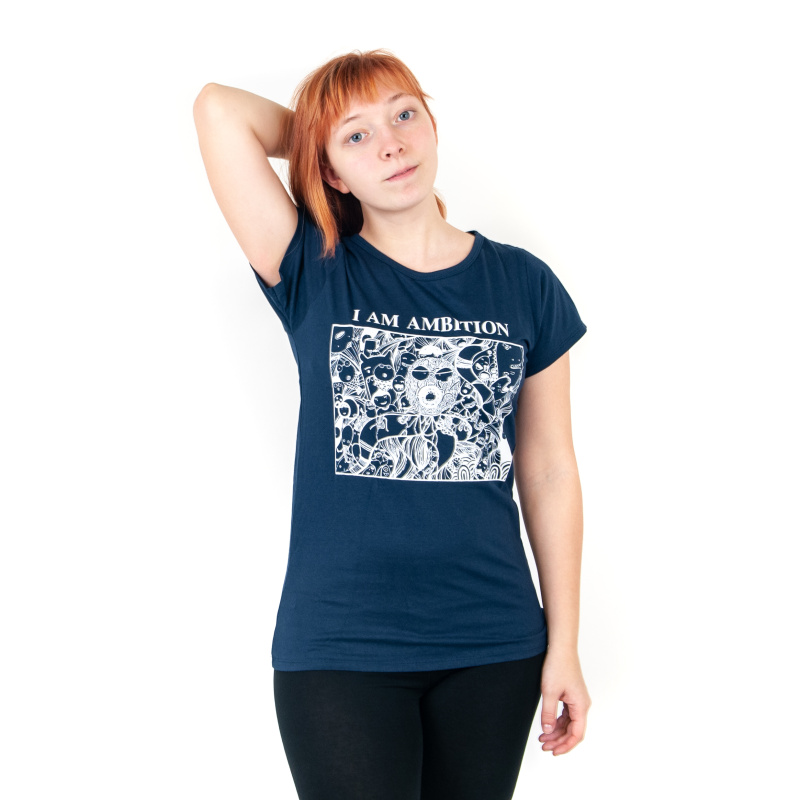 Dámské tričko s potiskem a pozitivní mantrou I AM AMBITION v modré barvě, velikost L