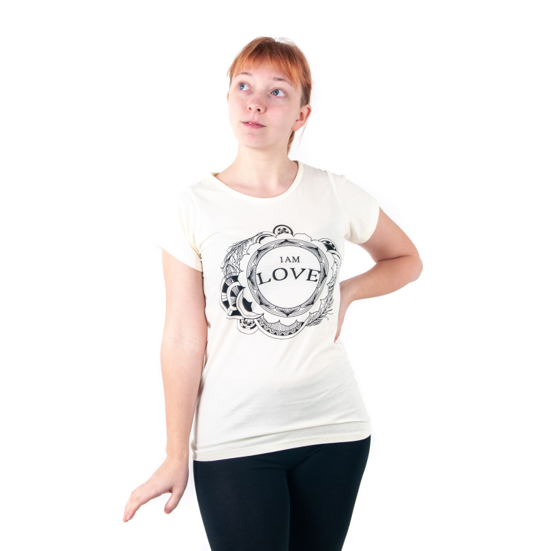 Dámské tričko s potiskem a pozitivní mantrou I AM LOVE v béžové barvě, velikost M