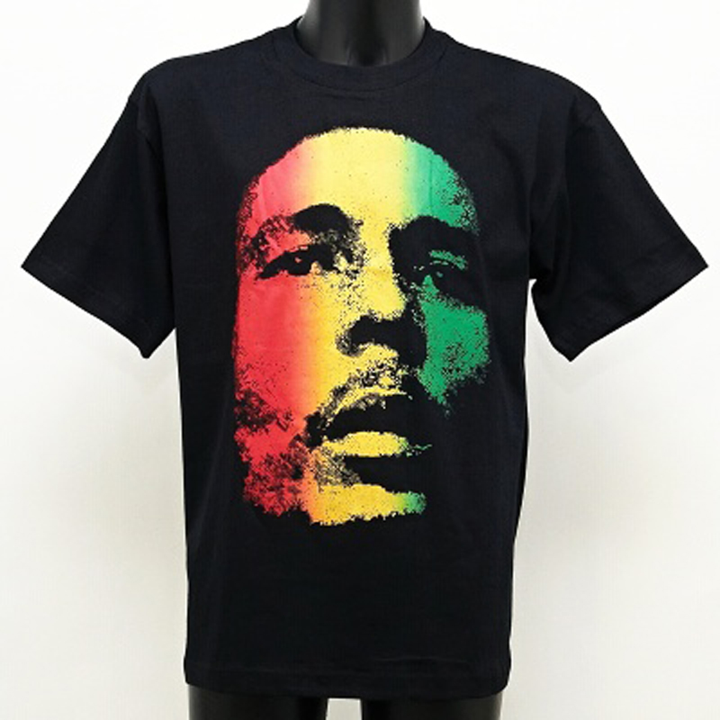Černé bavlněné tričko s moderně graficky zpracovanou hlavou Boba Marleye v rasta barvách vpředu a lvíčkem na zádech.