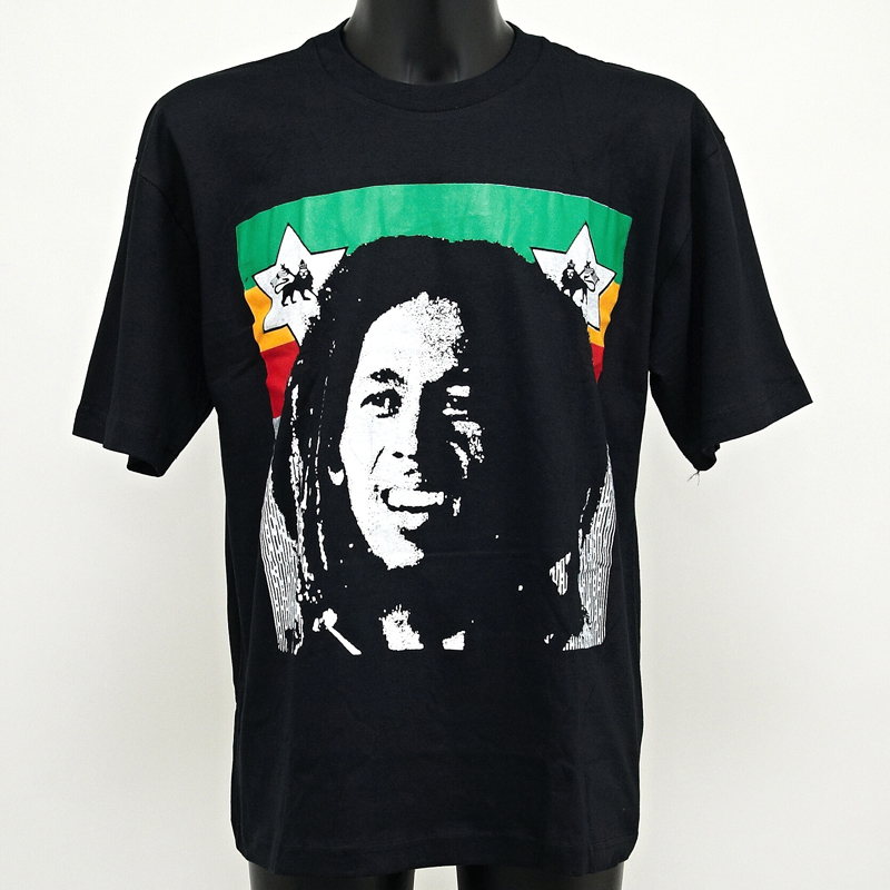 Pohodlné černé bavlněné tričko s hlavou Boba Marleye vpředu a lvíčkem v rasta barvách na zádech.