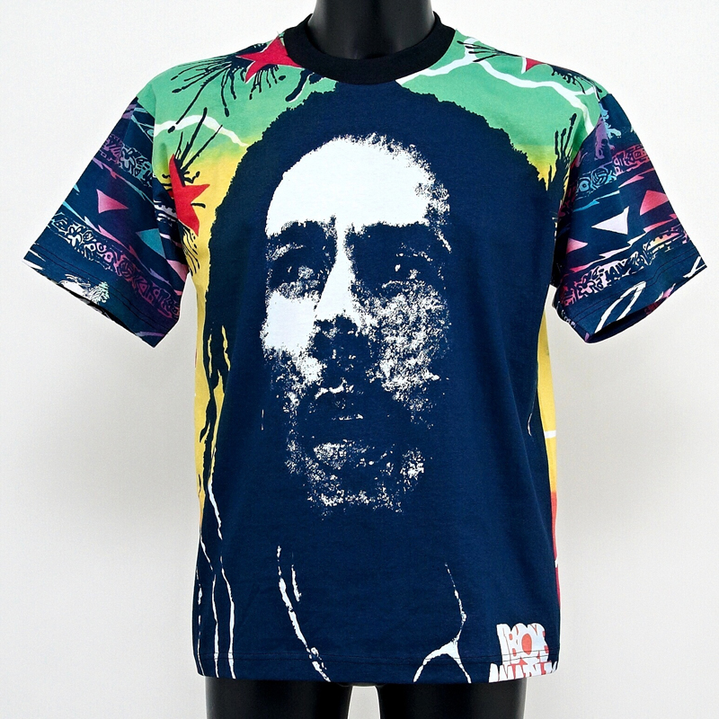 Bavlněné tričko s moderně graficky ztvárněnou hlavou Boba Marleye vpředu a s konopným listem a nápisem Catch a Fire v rasta barvách na zádech.
