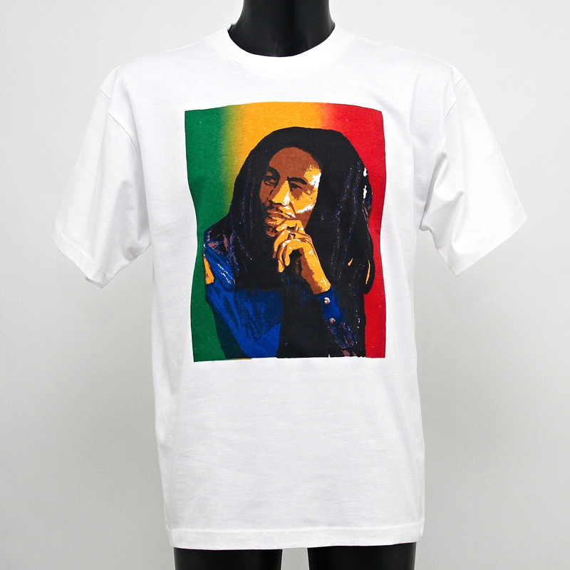 Pohodlné bílé bavlněné tričko s hlavou Boba Marleye vpředu a lvíčkem v rasta barvách na zádech.