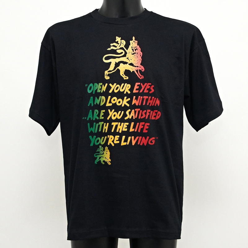 Pohodlné černé bavlněné tričko s motivem lva a nápisem Open Your Eyes... v rasta barvách vpředu a se lvíčkem na zádech.