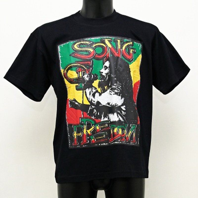 Pohodlné černé bavlněné tričko s motivem zpívajícího Boba Marleye vpředu a lvíčkem v rasta barvách na zádech.