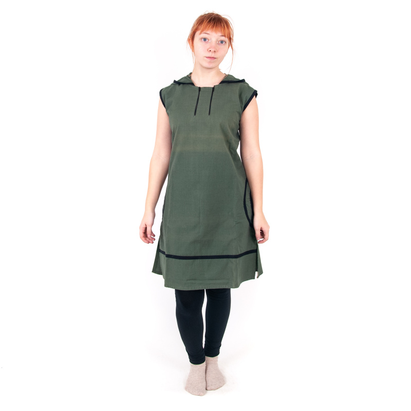 Originální tunika z pevného bavlněného plátna bez rukávů s kapucí a kapsami, opatřená zipy u krku pro snadnější oblékání.