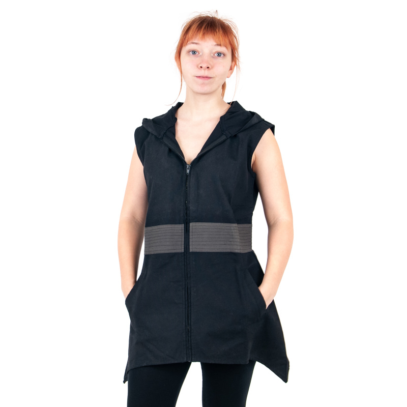 Dámská tunika "A" tvaru s cípy, které přesahují délku tuniky o 15cm. Zapínání je na zip, kapuce je do tvaru V.