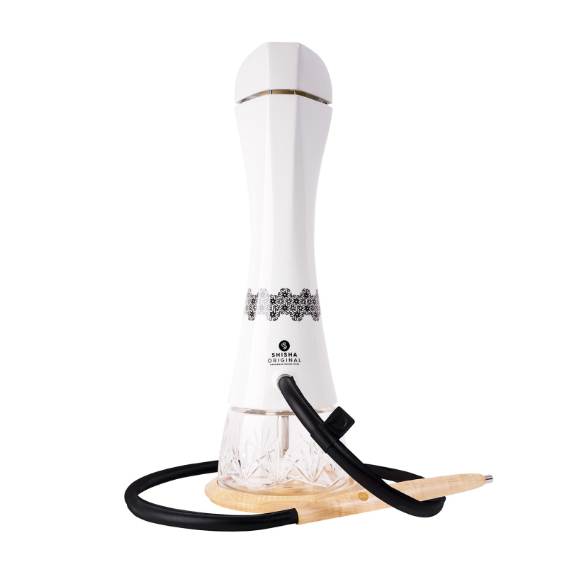 Černý ornamentový pruh dokola objímající bílé porcelánové tělo a váza z českého křišťálového skla ve verzi Lux. Vodní dýmka Shisha Original Aqua z řady Aristo s decentním zdobením pro vyznavače jednoduchého designu. Na těle najdete také logo značky umístěné nad vývodem na hadici.