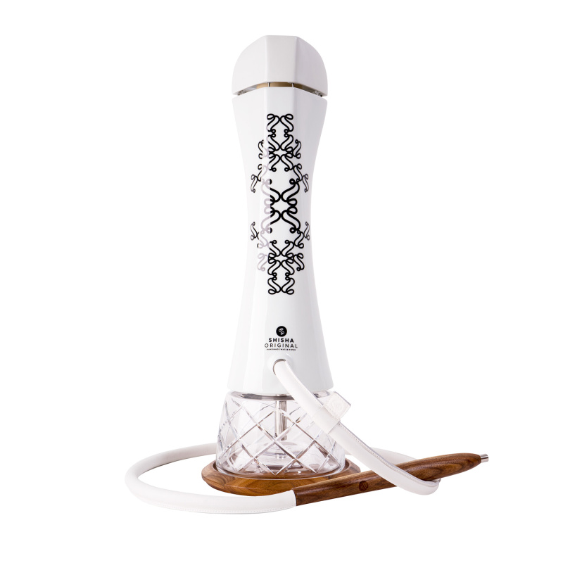 Téhle dýmky se nelze nevšimnout. Černý ornament tvoří podstatnou část přední strany bílého porcelánového těla vodní dýmky Shisha Original Terra z řady Aristo, a zrak upoutá i váza z českého křišťálového skla ve verzi Magma Cubica. Na těle najdete také logo značky umístěné nad vývodem na hadici.