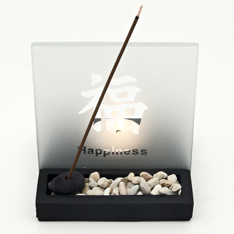 Čarovná Zenová zahrádka na čajové svíčky. Čínský znak štěstí jemně září přes matně skleněnou destičku. Vepředu umístěný stojánek na vonnou tyčinku dotváří příjemnou atmosféru. Skvělý dárek pro každého, samozřejmě i pro Vás. Rozměry destičky: 10 x 10 cm. Balení obsahuje: kamenný základ se stojánkem na čajovou svíčku, skleněnou destičku, oblázky na Zenovou zahrádku, stojánek na vonné tyčinky.